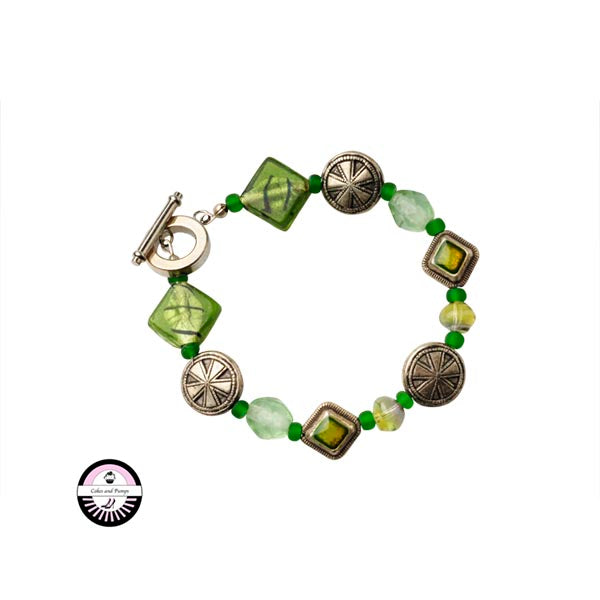 Bracelet with green glass beads and in between metal colored, decorated beads,