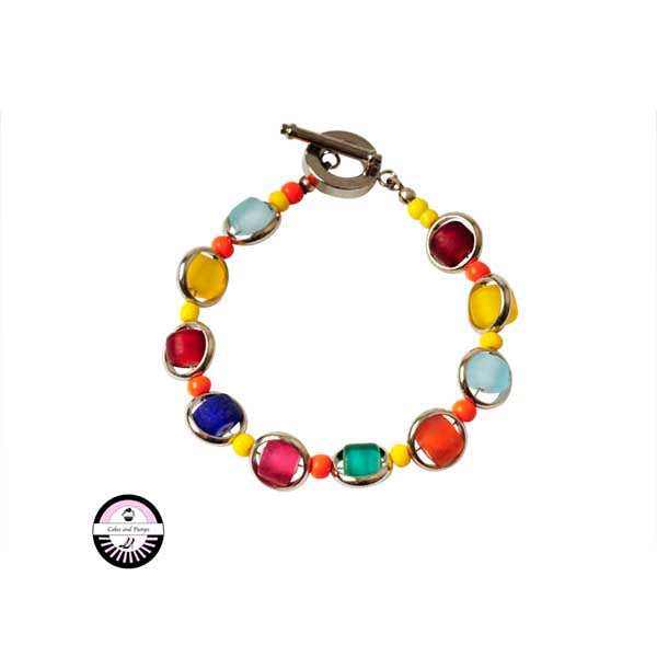 Bracelet with metal rings and in between yellow, orange, green, lightblue pink and red glass beads,