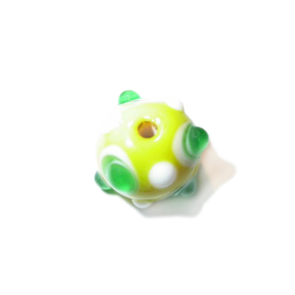 Gele handgemaakte glaskraal met witte en groene uitsteeksels